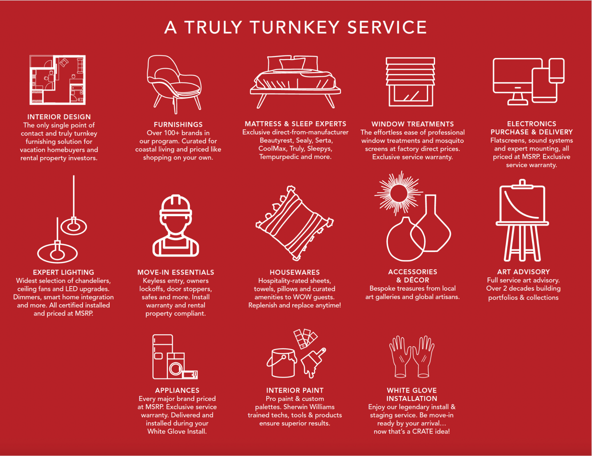 "We are so impressed by the CRATE Interiors service and meeting the crew this week was fantastic. Some of our neighbors are here trying to do the furnishings process themselves, it's alot of work, frustration and taking much longer than expected. We were thrilled to arrive here and find our new place ready to enjoy.